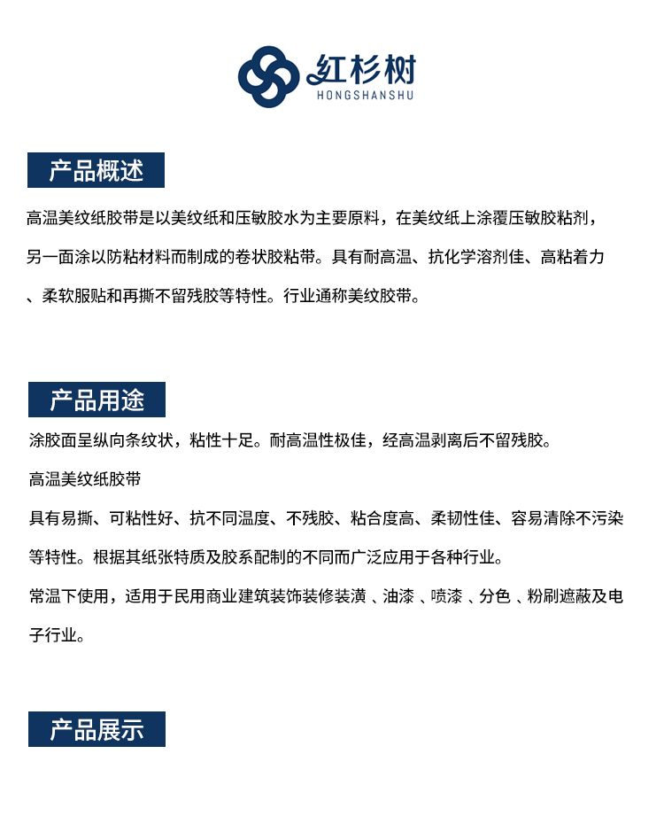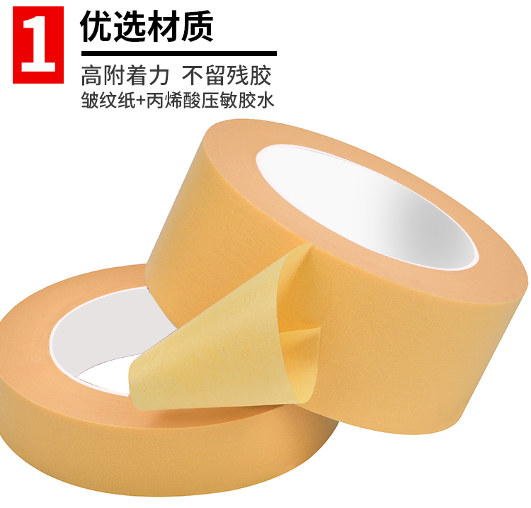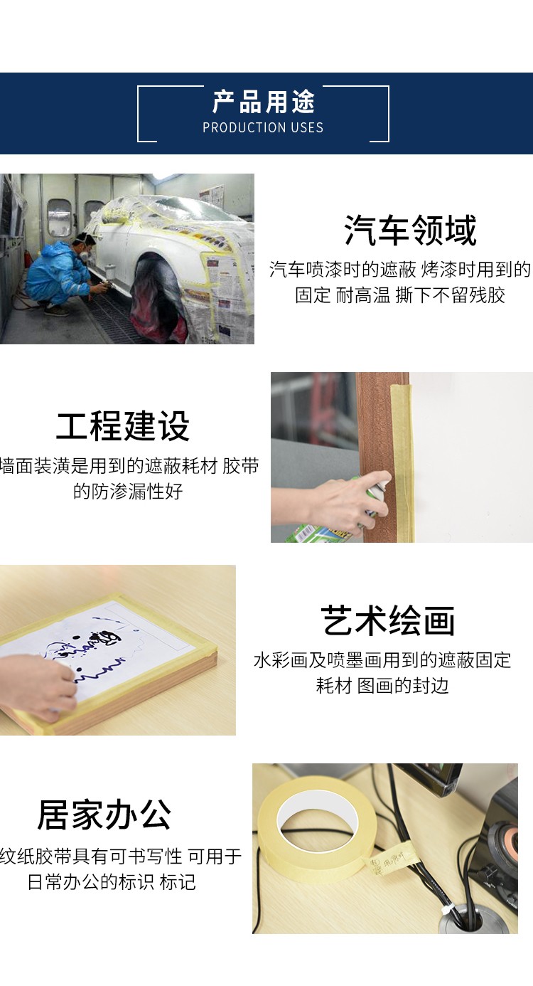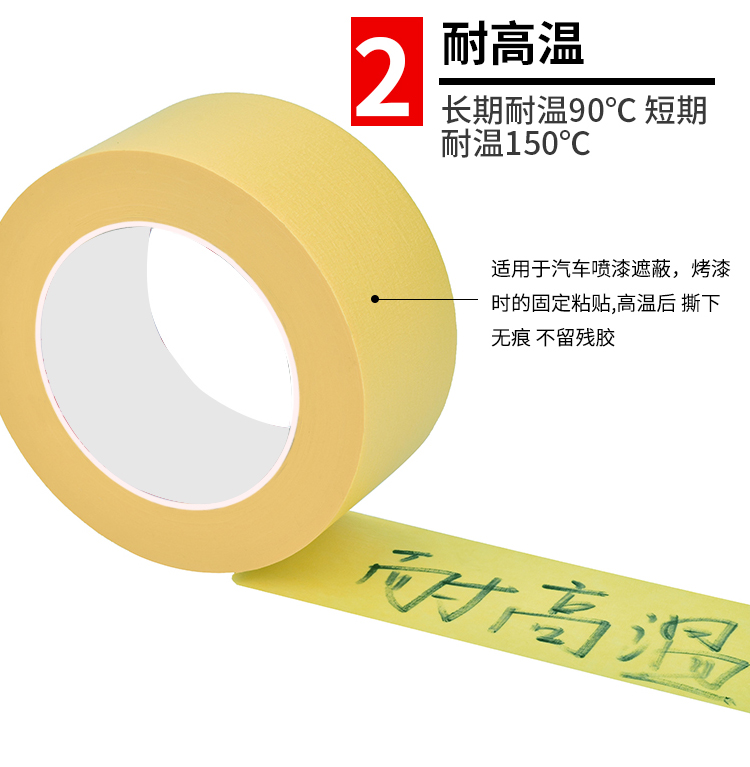 - 高溫美紋紙膠帶是以美紋紙和壓敏膠水為主要原料,在美紋紙上涂覆壓敏膠粘劑,另一面涂以防粘材料而制成的卷狀膠粘帶。具有耐高溫、抗化學(xué)溶劑佳、高粘著力、柔軟服貼和再撕不留殘膠等特性。