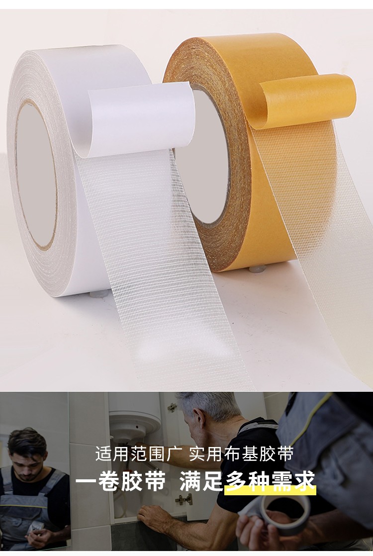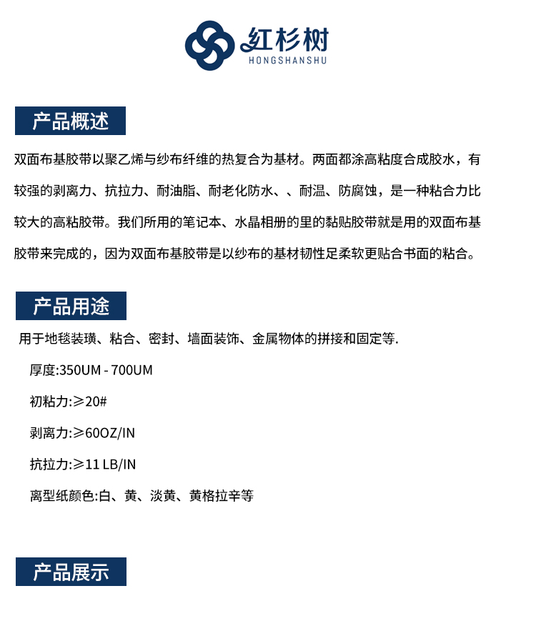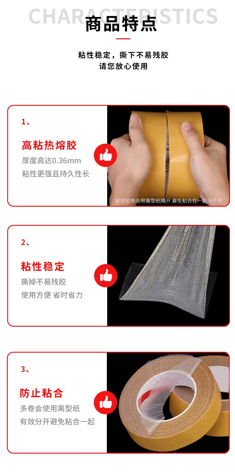 - 以易撕紗布纖維為基材,涂高粘度熱熔雙面膠,并與雙面離型紙復(fù)合而成。具有穩(wěn)定的雙面粘性、拉力強度大、粘力強、剝離力高的特性 主要的用途:用于地毯裝璜、粘合、密封、墻面裝飾、金屬物體的拼接和固定等.