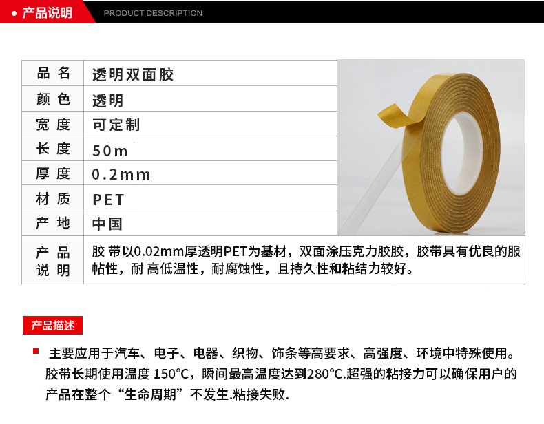- PET雙面膠一般為透明和黑色兩種,厚度規(guī)格是0.03-0.25MM,適用于更寬的溫度范圍和惡劣環(huán)境。